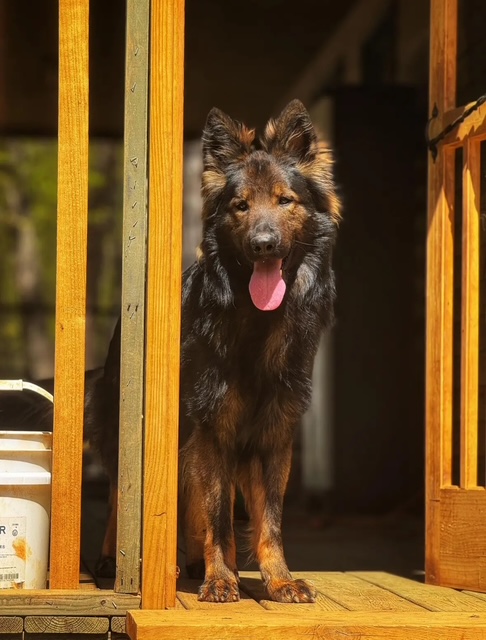 Everyone loves this boy, and we’re partial too. He is a black sable long coat with richer red undertones. He has a very fun, bubbly, personality and demonstrates natural drives for things like tracking. He can go anywhere as well and do anything!